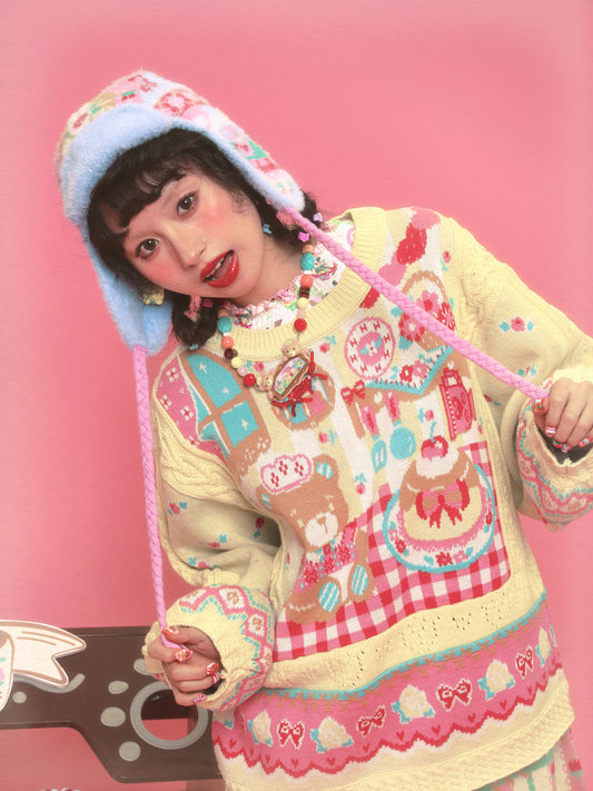 Creamy White Teacup Bear Fair Isle Mink Fur Warm Knitted Cardigan