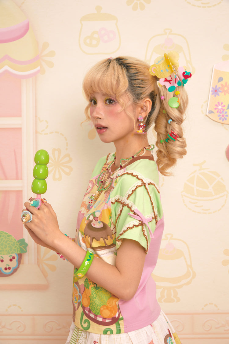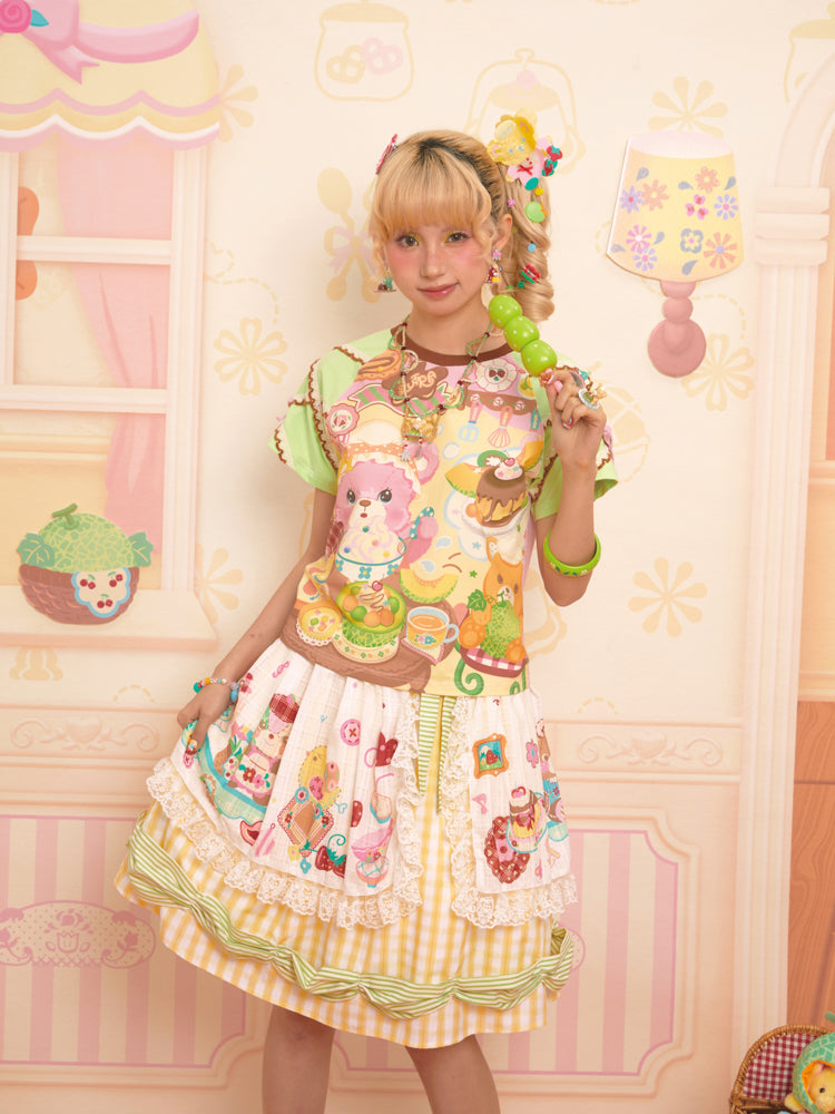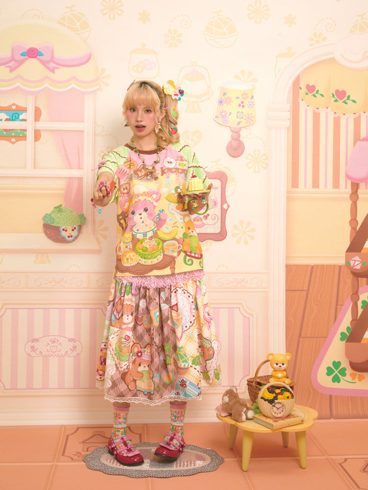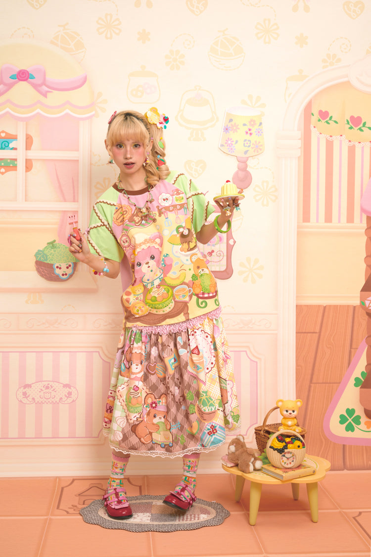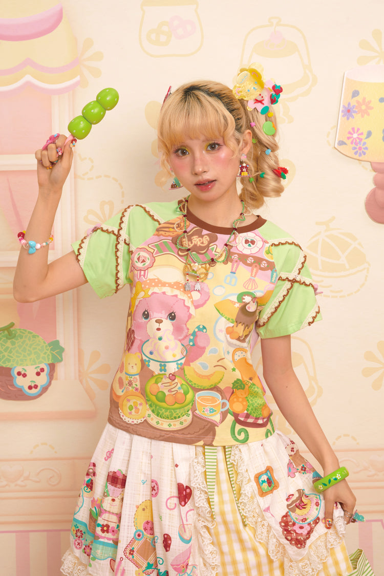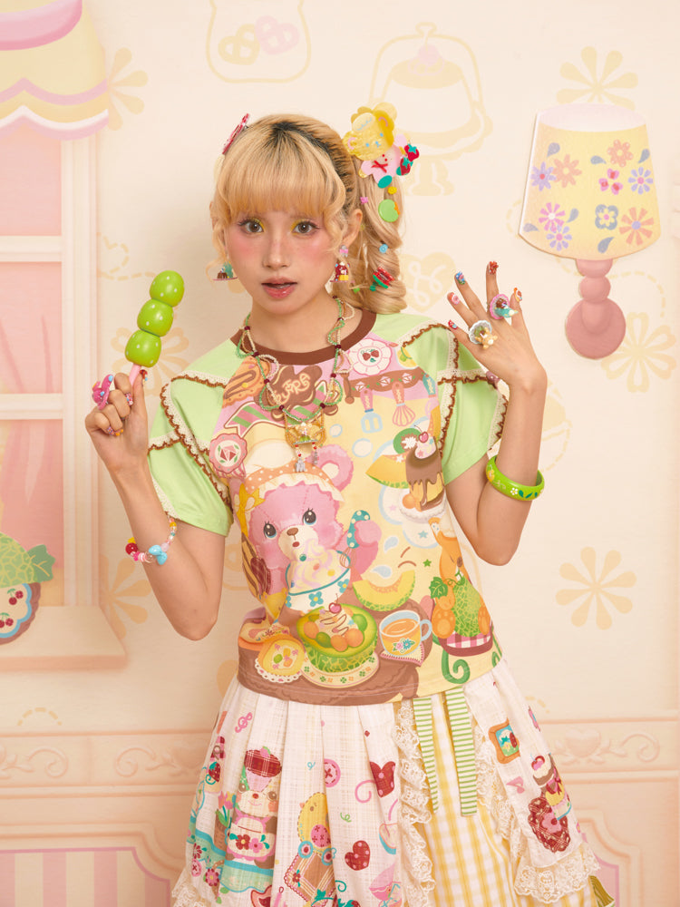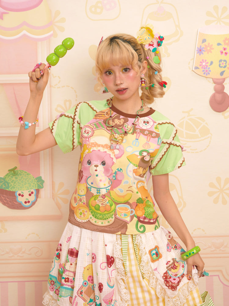 Original Bear Teahouse Printed Stitching Contrast Color Raglan Round Neck T-Shirt Short Sleeves