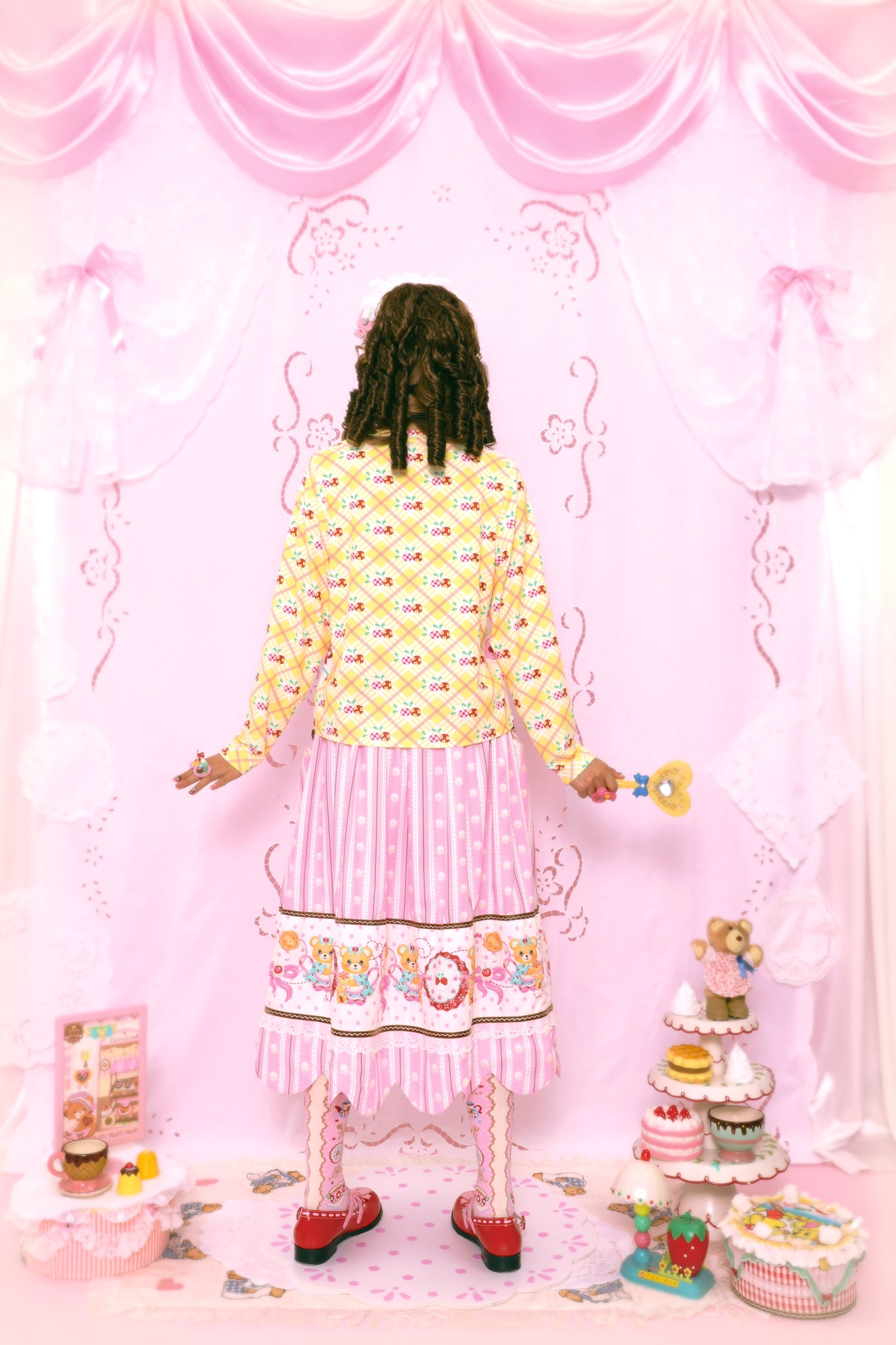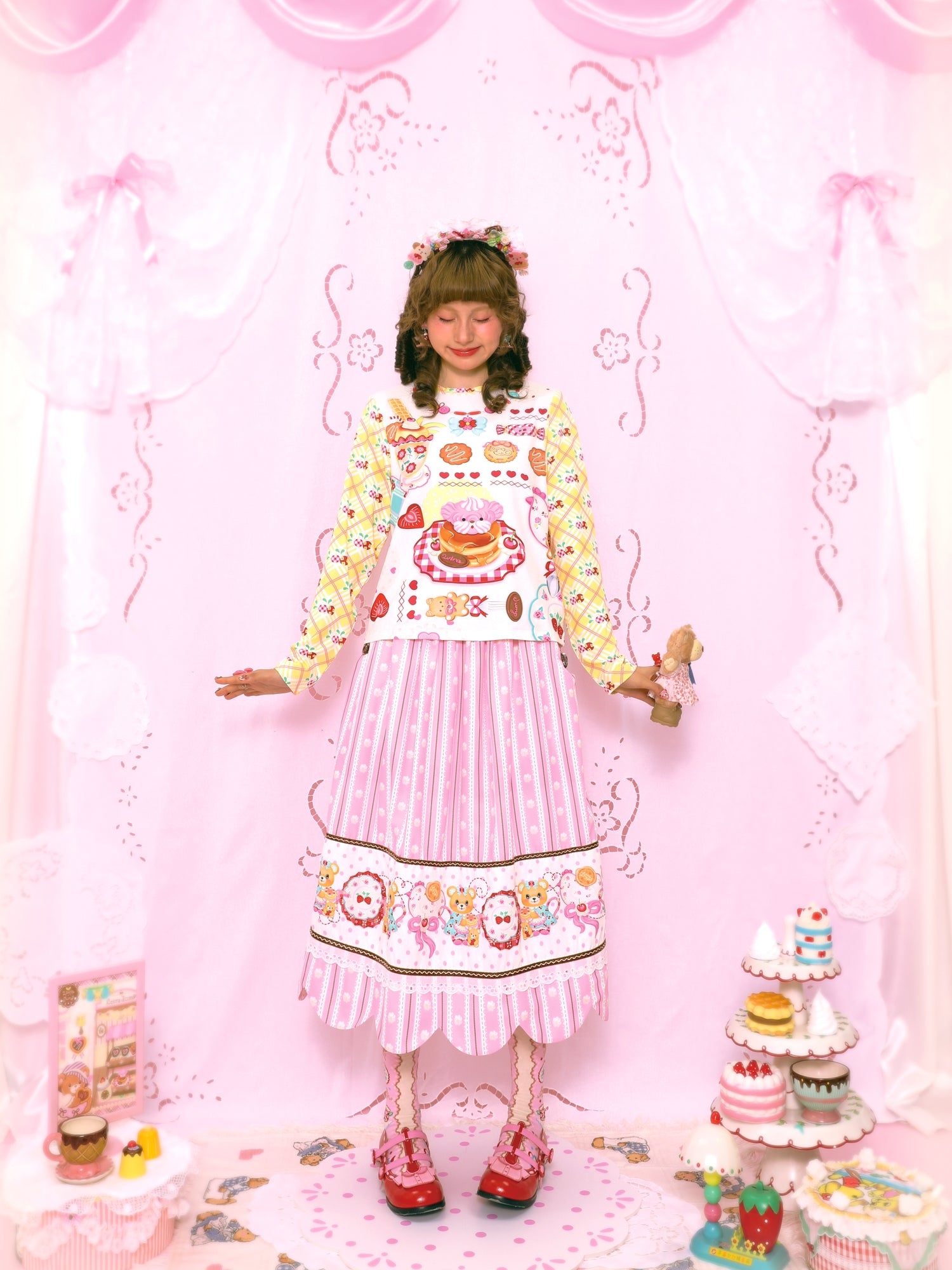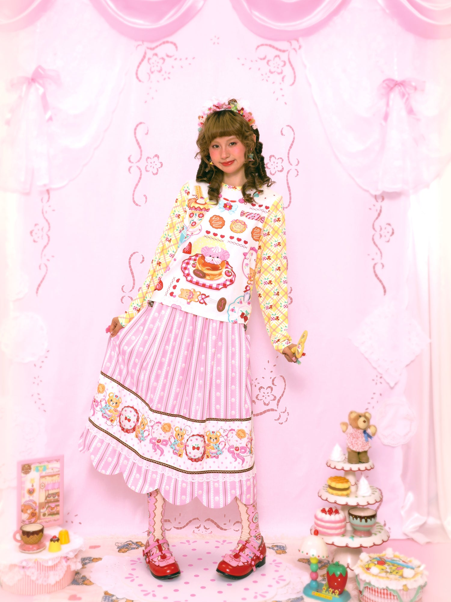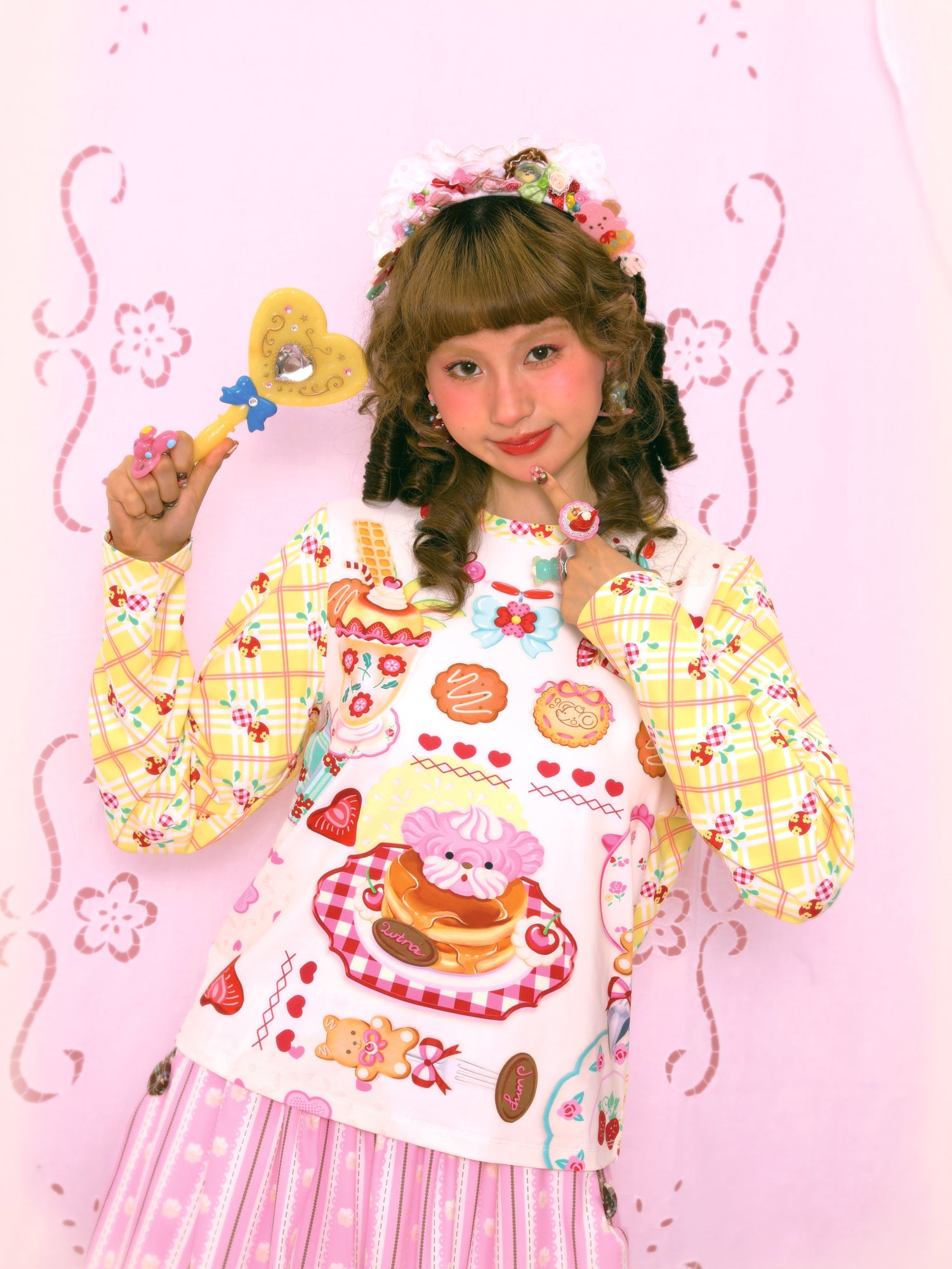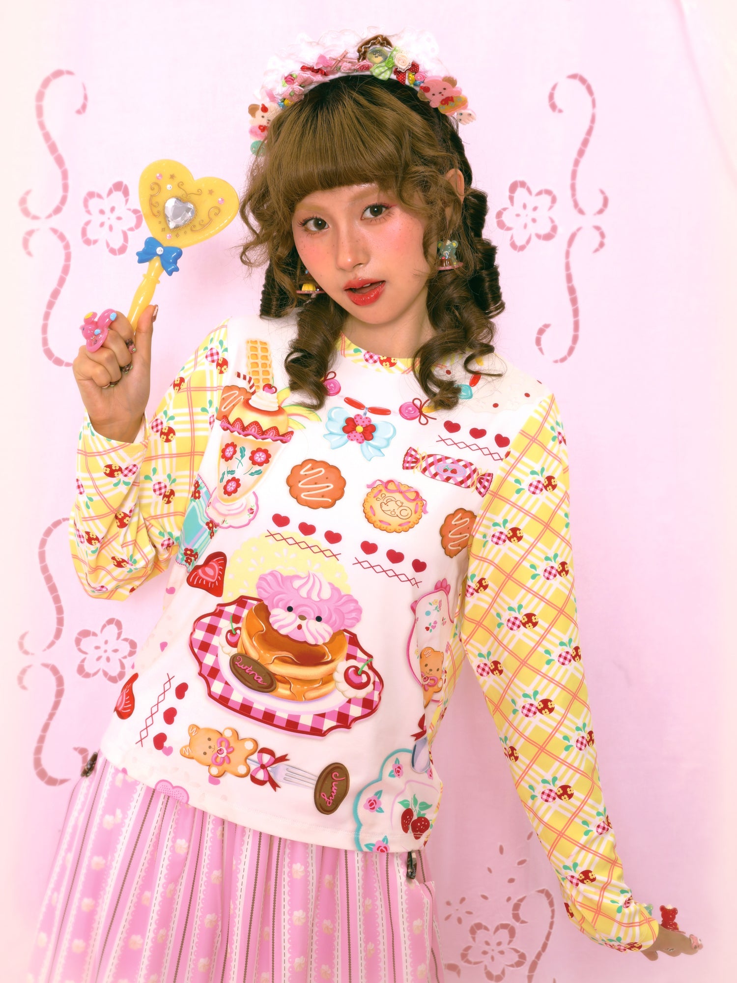 Original dessert print yellow plaid contrast color long sleeve elastic versatile bottom